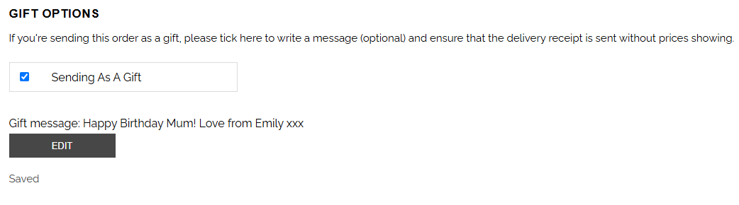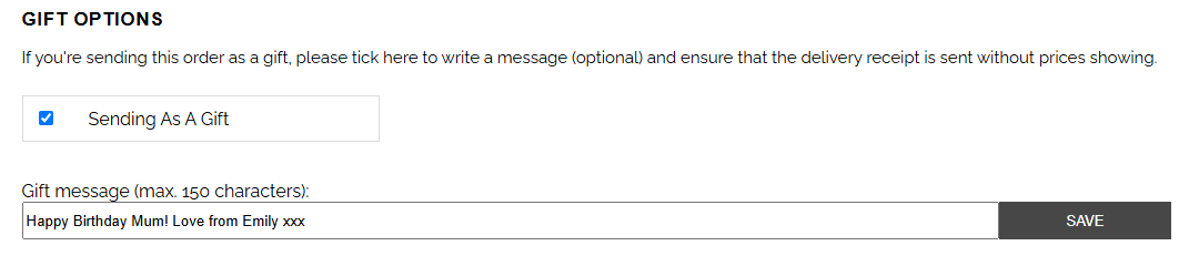 - A box will also appear where you can enter a gift message for the recipient. Please ensure you SAVE the message.